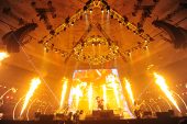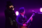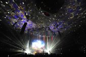 雨降るオープニング映像ののち、ステージ下からゆっくりとせり上がってきたのは、横1列に並び、久々に揃った4人の姿。待ち構えていたオーディエンスが大歓声で迎える。